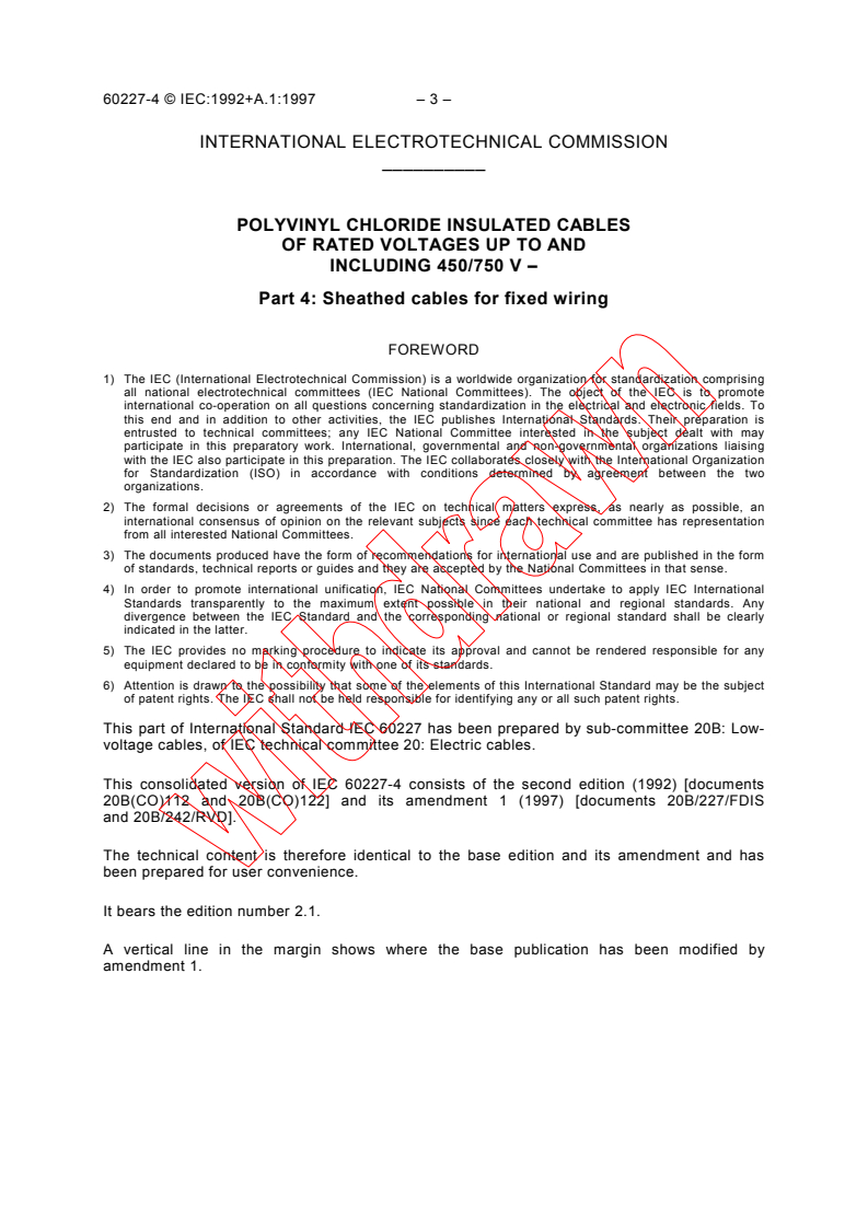 IEC 60227-4:1992 (Amendment 1:1997) specifies requirements for polyvinyl chloride (PVC) insulated and PVC sheathed cables intended for fixed wiring with a rated voltage of 300/500 V (part of the broader IEC 60227 series covering PVC insulated cables up to 450/750 V). It covers construction, dimensional limits, materials and mandatory tests for light PVC-sheathed cables (code designation 60227 IEC 10).