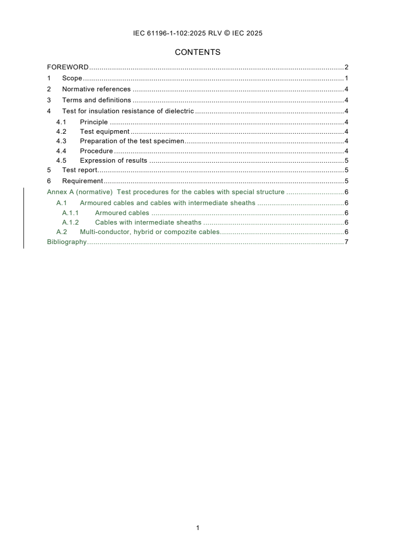 IEC 61196-1-102:2025 applies to coaxial communication cables. It specifies test methods for determining the insulation resistance of coaxial cables. It is intended to detect the flaws in the dielectric of finished coaxial cables. This second edition cancels and replaces the first edition, published in 2005. This edition constitutes a technical revision.