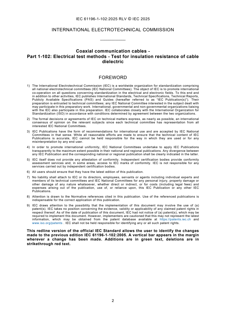 IEC 61196-1-102:2025 applies to coaxial communication cables. It specifies test methods for determining the insulation resistance of coaxial cables. It is intended to detect the flaws in the dielectric of finished coaxial cables. This second edition cancels and replaces the first edition, published in 2005. This edition constitutes a technical revision. This edition includes the following significant technical changes with respect to the previous edition: a) the scope was extended; b) the procedure is updated for the period of discharge and the test sample with high insulation resistance; c) the unit of cable length has been amended; d) the test procedures for the cables with special structure are specified in Annex A.