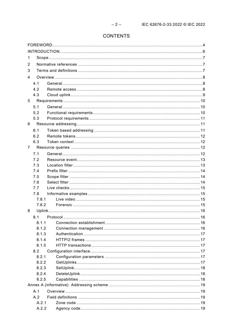 IEC 62676-2-33:2022 is a standard published by the International Electrotechnical Commission (IEC). Its full title is "Video surveillance systems for use in security applications - Part 2-33: Video transmission protocols – Cloud uplink and remote management system access". This standard covers: IEC 62676-2-33:2022 specifies management systems interfaces and mechanisms for remote operational access to physical security devices such as video surveillance devices and systems. For video surveillance, the use cases focus on accessing live video and retrieving recordings. The mechanisms defined in this document are not restricted to surveillance applications, but also cover remote access to security systems and electronic access control systems. Configuration of devices and management systems is out of the scope of this document.
