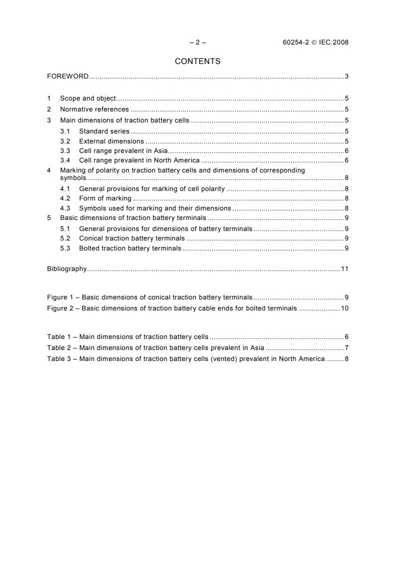 IEC 60254-2:2008 is a standard published by the International Electrotechnical Commission (IEC). Its full title is "Lead-acid traction batteries - Part 2: Dimensions of cells and terminals and marking of polarity on cells". This standard covers: This part of IEC 60254 is applicable to lead-acid traction batteries used as power sources for electric propulsion. The object of the present standard is to specify: - the maximum external (overall) dimensions of traction battery cells, that is, the width, the height and the length; - the form of the marking of traction battery cell polarity and dimensions of corresponding symbols; - the basic dimensions of some commonly used traction battery terminals designed to connect output cables to the battery; - the dimensions of cells commonly used in Asia and North America. This fourth edition cancels and replaces the third edition published in 1997 and its Amendment 1 (2000). It constitutes a technical revision. The main modification concerns the introduction of new dimensions.