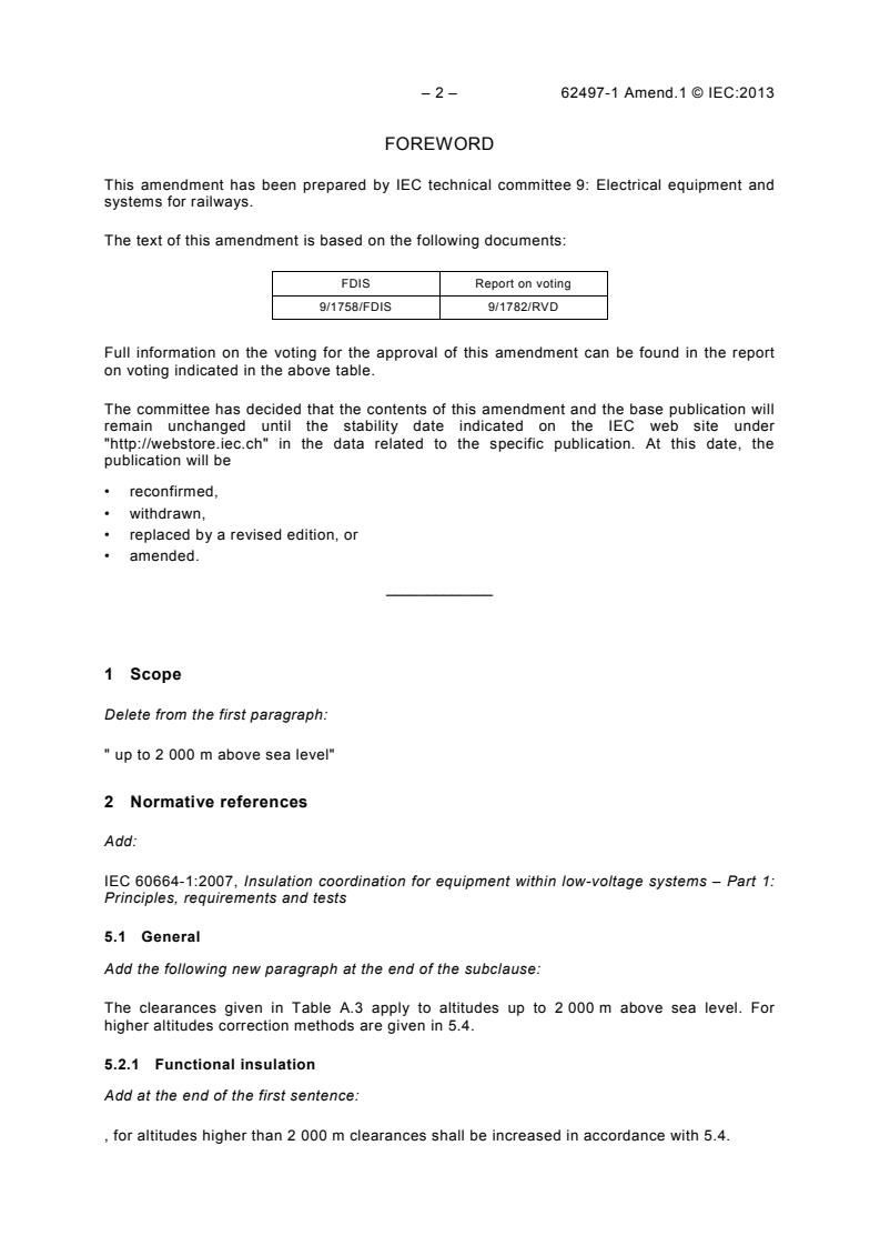 Keywords: IEC 62497-1 Amendment 1, railway insulation coordination, clearances, creepage distances, electrical safety, altitude correction, railway electrical standards, electrical insulation design, railway equipment certification, IEC 60664-1, IEC 60060-1, pollution degree, impulse voltage.
