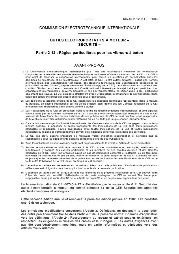 IEC 60745-2-12:2003 is a standard published by the International Electrotechnical Commission (IEC). Its full title is "Hand-held motor-operated electric tools - Safety - Part 2-12: Particular requirements for concrete vibrators". This standard covers: Deals with the safety of hand-held motor-operated or magnetically driven tools, specific requirements for concrete vibrators. The rated voltage being not more than 250 V for single-phase a.c. or d.c., and 440 V for three-phase a.c. tools.