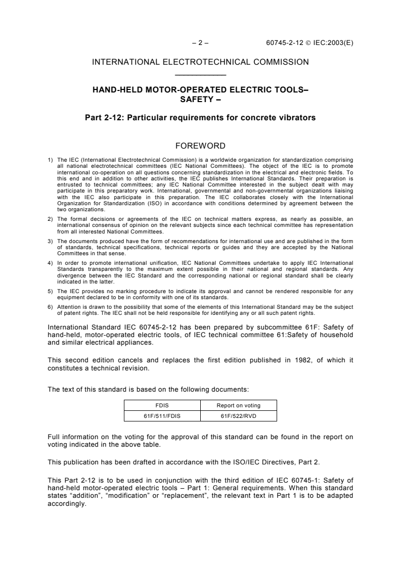IEC 60745-2-12:2003 is an International Electrotechnical Commission (IEC) standard that provides specific safety requirements for hand-held motor-operated electric tools designed as concrete vibrators. Concrete vibrators are essential in construction for compacting concrete to ensure uniformity and remove air bubbles. This standard applies to concrete vibrators with rated voltages not exceeding 250 V for single-phase AC or DC and 440 V for three-phase AC tools. It is part of the IEC 60745 series, which covers general safety requirements for hand-held motor-operated electric tools, with this part focusing on the particular needs and risks associated with concrete vibrators.