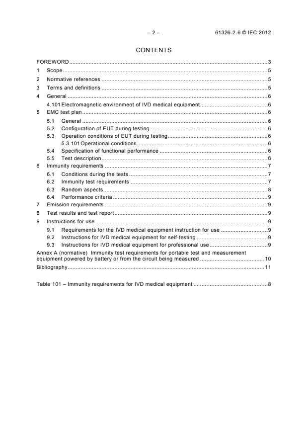 IEC 61326-2-6:2012 specifies minimum requirements for immunity and emissions regarding electromagnetic compatibility for in vitro diagnostic medical equipment, taking into account the particularities and specific aspects of this electrical equipment and their electromagnetic environment. This second edition cancels and replaces the first edition published in 2005 and constitutes a technical revision. It includes the following significant technical change: update of the document with respect to IEC 61326-1:2012. This publication is to be read in conjunction with IEC 61326-1:2012.
