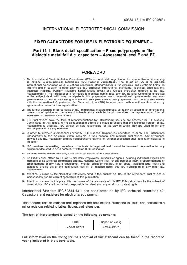 IEC 60384-13-1:2006 is a standard published by the International Electrotechnical Commission (IEC). Its full title is "Fixed capacitors for use in electronic equipment - Part 13-1: Blank detail specification - Fixed polypropylene film dielectric metal foil d.c. capacitors - Assessment level E and EZ". This standard covers: IEC 60384-13-1:2006(E) is a supplementary document to the sectional specification and contains requirements for style and layout and minimum content of detail specifications. Detail specifications not complying with these requirements may not be considered as being in accordance with IEC specifications nor shall they so be described. The contents of the corrigendum of March 2009 have been included in this copy.