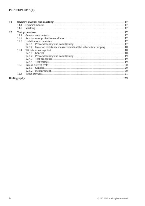 ISO 17409:2015 specifies electric safety requirements for conductive connections of electrically propelled road vehicles to an external electric power supply using a plug or vehicle inlet. It applies to electrically propelled road vehicles with voltage class B electric circuits. In general, it may apply to motorcycles and mopeds if no dedicated standards for these vehicles exist. It applies only to vehicle power supply circuits. It applies also to dedicated power supply control functions used for the connection of the vehicle to an external electric power supply. It does not provide requirements regarding the connection to a non-isolated d.c. charging station. It does not provide comprehensive safety information for manufacturing, maintenance, and repair personnel. The requirements when the vehicle is not connected to the external electric power supply are specified in ISO 6469-3. NOTE 1 This International Standard does not contain requirements for vehicle power supply circuits using protection by class II or double/reinforced insulation but it is not the intention to exclude such vehicle applications. NOTE 2 Requirements for EV supply equipment are specified in IEC 61851.