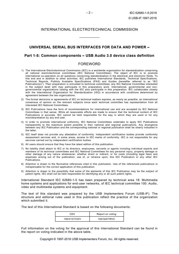 IEC 62680-1-5:2019 is an international standard published by the International Electrotechnical Commission (IEC) that defines the USB Audio 3.0 device class specification. This standard establishes the minimum capabilities and characteristics audio devices must support to comply with Universal Serial Bus (USB) interfaces for both data and power. It primarily targets audio devices or functions embedded within composite devices responsible for managing audio, voice, and sound-related functionalities. Key functionalities covered include analog and digital audio data handling as well as direct control features such as volume and tone control. It excludes transport mechanism controls like tape or CD-ROM drives.