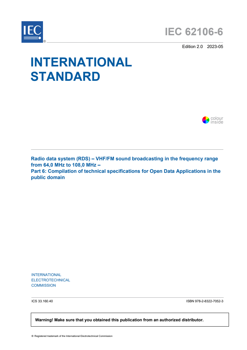IEC 62106-6:2023 is a standard published by the International Electrotechnical Commission (IEC). Its full title is "Radio data system (RDS) - VHF/FM sound broadcasting in the frequency range from 64,0 MHz to 108,0 MHz - Part 6: Compilation of technical specifications for Open Data Applications in the public domain". This standard covers: IEC 62106-6:2023 contains the technical specifications for Open Data Applications in the public domain. This document is maintained by the RDS Forum Office. The RDS Forum Office applies an easy procedure for registering new Open Data Applications, to ensure that they can be used without the need to change the RDS standard. The ODA feature permits defining new applications that can be decoded on a receiver. The receiver needs to the adequate software handler for the specific AID, which identifies the application. Receivers that have not implemented the software handler needed for decoding are not affected by ODA data received for any of the applications already defined and specified. The procedure for registering a new ODA is described in IEC 62106-3. IEC 62106-6:2023 cancels and replaces the first edition published in 2018. This edition constitutes a technical revision. This edition includes the following significant technical changes with respect to the previous edition: a) Annex E: coding of station logo; b) Annex F: coding of slideshow; c) Annex G: coding of internet connection; d) Annex H: ODA tool – RDS data stream NFM.