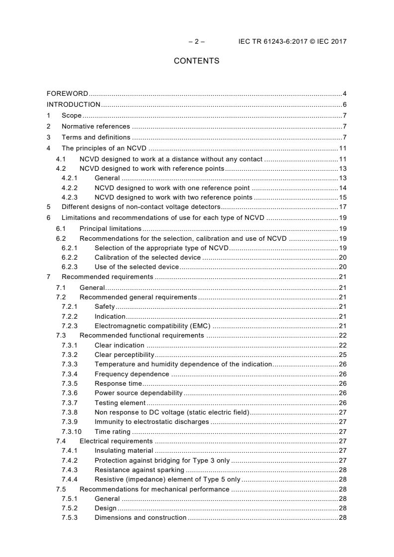 IEC TR 61243-6:2017은 이동 가능한 비접촉 전압 검출기 (NCVD)에 적용되는 문서로, 1 kV AC 이상의 명명 전압과 16 2/3 Hz, 50 Hz 및/또는 60 Hz의 주파수를 가진 전기 시스템에서 작동 전압의 존재 또는 부재를 나타내는 데 사용됩니다. 이 문서는 다른 원리도 사용할 수 있지만, 전기장 및 전압 기울기 검출 원리를 사용하는 장치와 그 동작에 대해서만 설명합니다. 이 문서는 성능 지침, 사용 권장 사항 및 선택을 위한 권장 최소 기준을 제시합니다.