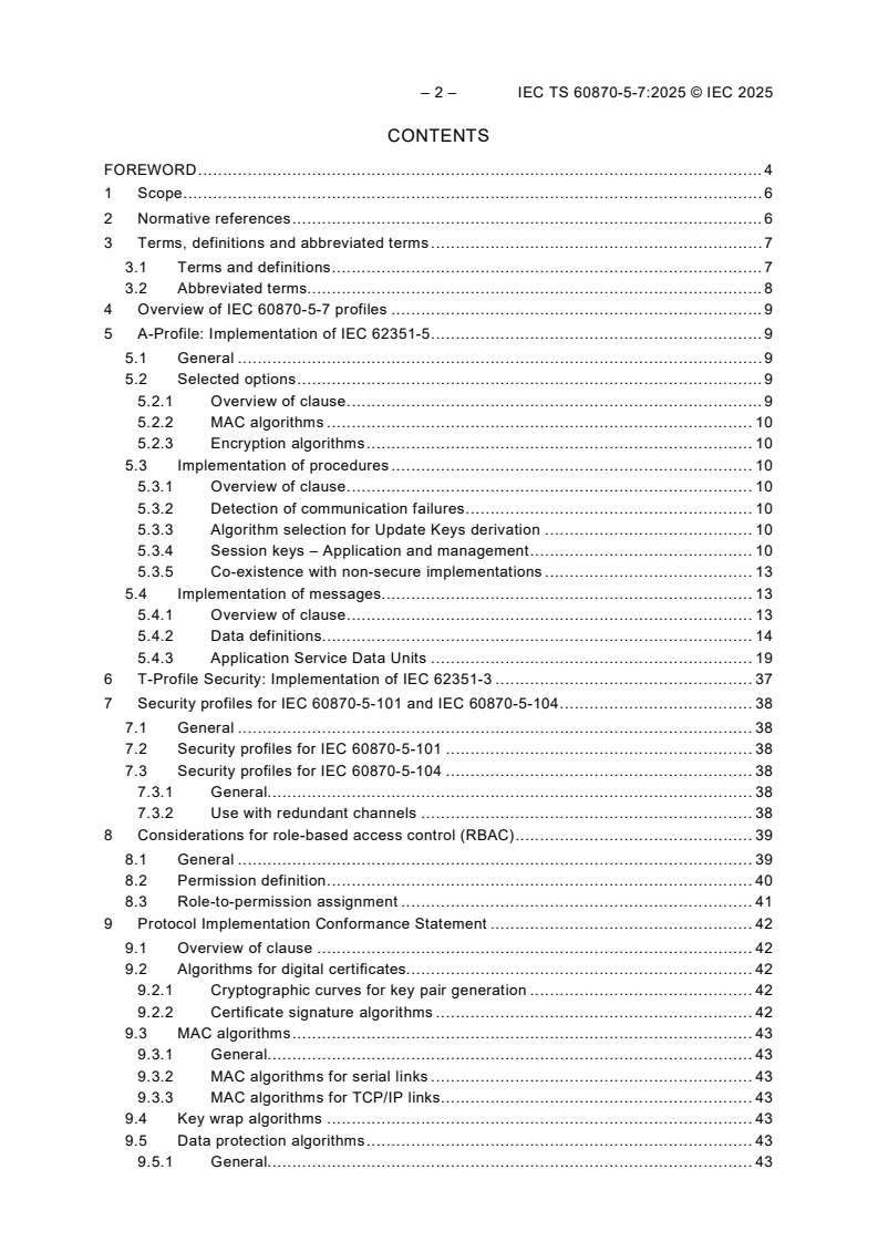 IEC TS 60870-5-7:2025, which is a technical specification, describes messages and data formats for implementing IEC 62351-5:2023 for secure communication as an extension to IEC 60870-5-101 and IEC 60870-5-104. The purpose of this document is to permit the receiver of any IEC 60870-5-101/-104 Application Protocol Data Unit (APDU) to verify that the APDU was transmitted by an authorized user and that the APDU was not modified in transit. This document is also intended to be used, together with the definitions of IEC 62351-3:2023, in conjunction with the IEC 60870-5-104 companion standard. The state machines, message sequences, and procedures for exchanging these messages are defined in IEC 62351-5:2023. This document describes only the message formats, selected options, critical operations, addressing considerations and other adaptations required to implement IEC 62351 in the IEC 60870-5-101 and IEC 60870-5-104 protocols. In addition to the previous edition, this new edition of this document also addresses role-based access control, by utilizing the IEC 62351-8 RBAC approach and the already defined role to permission mapping from IEC 62351-5:2023. The scope of this document does not include security for IEC 60870-5-102 or IEC 60870-5-103. IEC 60870-5-102 is in limited use only and will therefore not be addressed. Users of IEC 60870-5-103 desiring a secure solution need to implement IEC 61850 using the security measures from in IEC 62351 referenced in IEC 61850. Management of keys, certificates or other cryptographic credentials within devices or on communication links other than IEC 60870-5-101/104 is out of the scope of this document and might be addressed by other IEC 62351 publications in the future. This second edition cancels and replaces the first edition published in 2013. This edition constitutes a technical revision. This edition includes the following significant technical changes with respect to the previous edition: a) This edition has been completely revised with respect to the previous edition; b) Alignment with updated versions of IEC 62351-3:2023 and IEC 62351-5:2023; c) Definition of specific profiles for application layer and transport layer; d) Introduction of Session Initiation Request to handle situations in which the called station reestablishes a connection; e) Inclusion of multicast security for the unbalanced mode of IEC 60870-5-101 including key management; f) Consideration of RBAC based on IEC 62351-8. This Technical Specification is to be used in conjunction with IEC 62351-5:2023 and IEC 60870-5-104:2016.