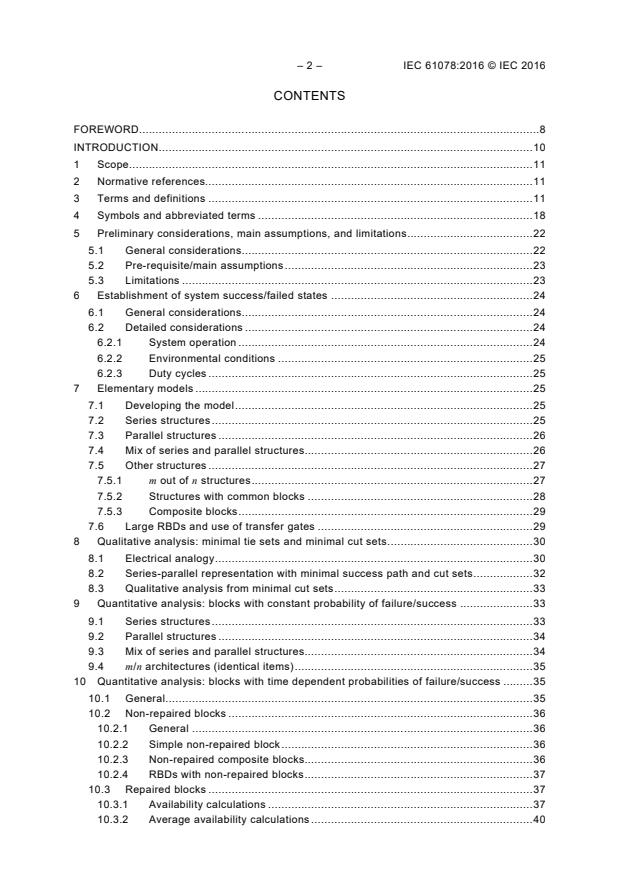 IEC 61078:2016 this International Standard describes: - the requirements to apply when reliability block diagrams (RBDs) are used in dependability analysis; - the procedures for modelling the dependability of a system with reliability block diagrams; - how to use RBDs for qualitative and quantitative analysis; - the procedures for using the RBD model to calculate availability, failure frequency and reliability measures for different types of systems with constant (or time dependent) probabilities of blocks success/failure, and for non-repaired blocks or repaired blocks; - some theoretical aspects and limitations in performing calculations for availability, failure frequency and reliability measures; - the relationships with fault tree analysis (see IEC 61025) and Markov techniques (see IEC 61165). This third edition cancels and replaces the second edition published in 2006. This edition constitutes a technical revision. This edition includes the following significant technical changes with respect to the previous edition: - the structure of the document has been entirely reconsidered, the title modified and the content extended and improved to provide more information about availability, reliability and failure frequency calculations; - Clause 3 has been extended and clauses have been introduced to describe the electrical analogy, the "non-coherent" RBDs and the "dynamic" RBDs; - Annex B about Boolean algebra methods has been extended; - Annex C (Calculations of time dependent probabilities), Annex D (Importance factors), Annex E (RBD driven Petri net models) and Annex F (Numerical examples and curves) have been introduced. Keywords: reliability block diagram (RBD)