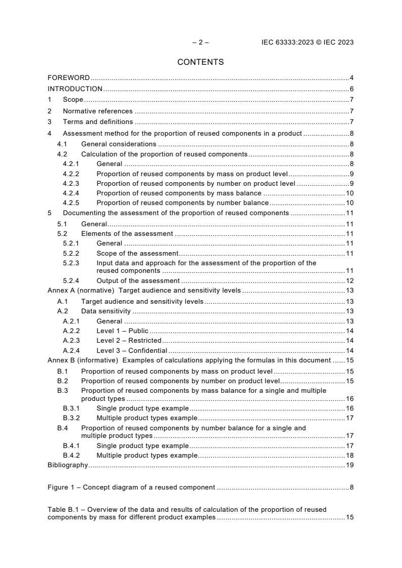 IEC 63333:2023 is a standard published by the International Electrotechnical Commission (IEC). Its full title is "General method for assessing the proportion of reused components in products". This standard covers: IEC 63333:2023 deals with the assessment of the proportion of reused components in products on a horizontal level, which can be applied at any point in the life of the product. This document applies to electrical and electronic products. It can also be applied to other product types. This document is intended to be used in the assessment of the proportion of reused components in products. It can also be used by technical committees when developing assessment methods dedicated to their product or product-group publications. Aspects like performance, validation, verification and suitability of reused components are not in the scope of this document. It is the responsibility of the user of this document to address these aspects. This document has the status of a horizontal publication in accordance with IEC Guide 108.