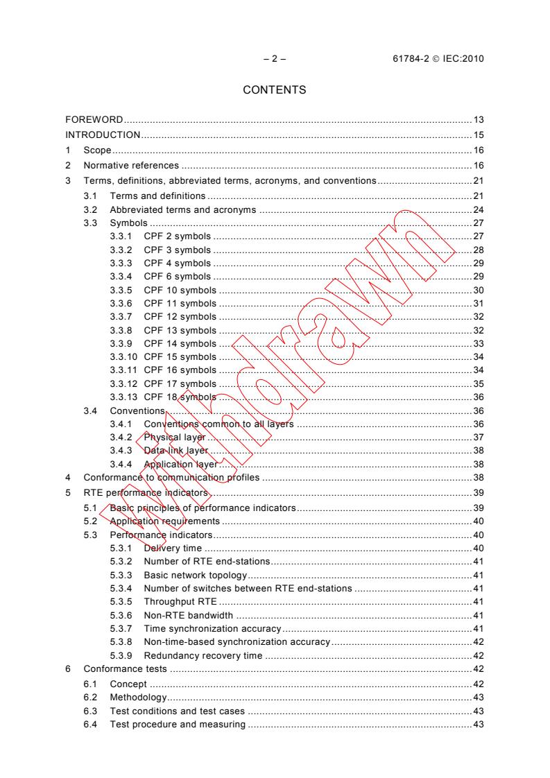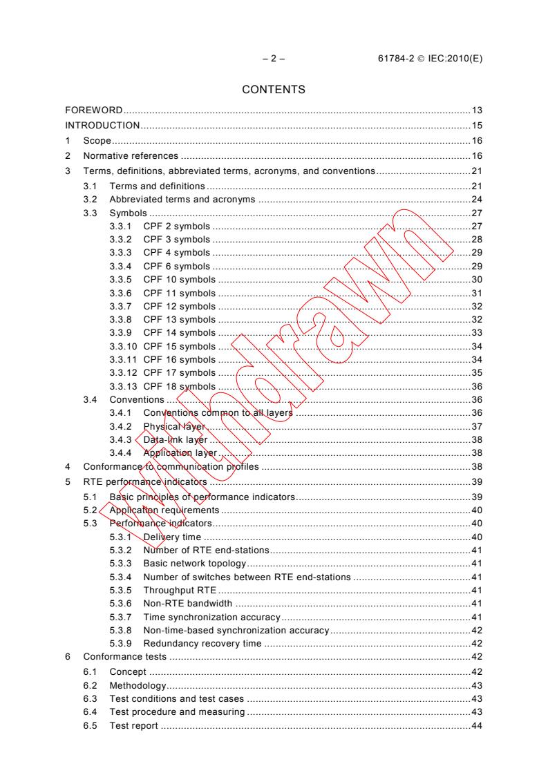 IEC 61784-2:2010 is a standard published by the International Electrotechnical Commission (IEC). Its full title is "Industrial communication networks - Profiles - Part 2: Additional fieldbus profiles for real-time networks based on ISO/IEC 8802-3". This standard covers: IEC 61784-2:2010 specifies performance indicators supporting classification schemes for Real-Time Ethernet (RTE) requirements; profiles and related network components based on ISO/IEC 8802-3, IEC 61158 series, and IEC 61784-1; RTE solutions that are able to run in parallel with ISO/IEC 8802-3-based applications. These communication profiles are called Real-Time Ethernet communication profiles. This second edition cancels and replaces the first edition published in 2007 and constitutes a technical revision. The main changes with respect to the previous edition are: - update of the dated references to the IEC 61158 series, to IEC 61784-1, to the IEC 61784-3 series, to the IEC 61784-5 series and to IEC 61918 throughout the document; - update of selection tables for CPF 2, CPF 3, CPF 11 and CPF 14; - addition of a new profile CP 11/2 in 12.3; - addition of a new profile CP 14/3 in subclause 15.5; - addition of a new Communication Profile Family - CPF 17; - new subclause 3.3.12 (CPF 17 symbols); - new Clause 18 for CPF 17 with one profile; - addition of a new Communication Profile Family - CPF 18; - new subclause 3.3.13 (CPF 18 symbols); - new Clause 19 for CPF 18 with one profile; - specification changes for CPF3; - update of the requirements for all conformance classes; - added precise timing requirements for IP; - updated timing requirements for IO devices; - added precise timing requirements for PTCP; - increasing the amount of synchronized devices in line; - integrating the fast startup as additional feature. This bilingual version published in 2011-12, corresponds to the English version published in 2010-07.
