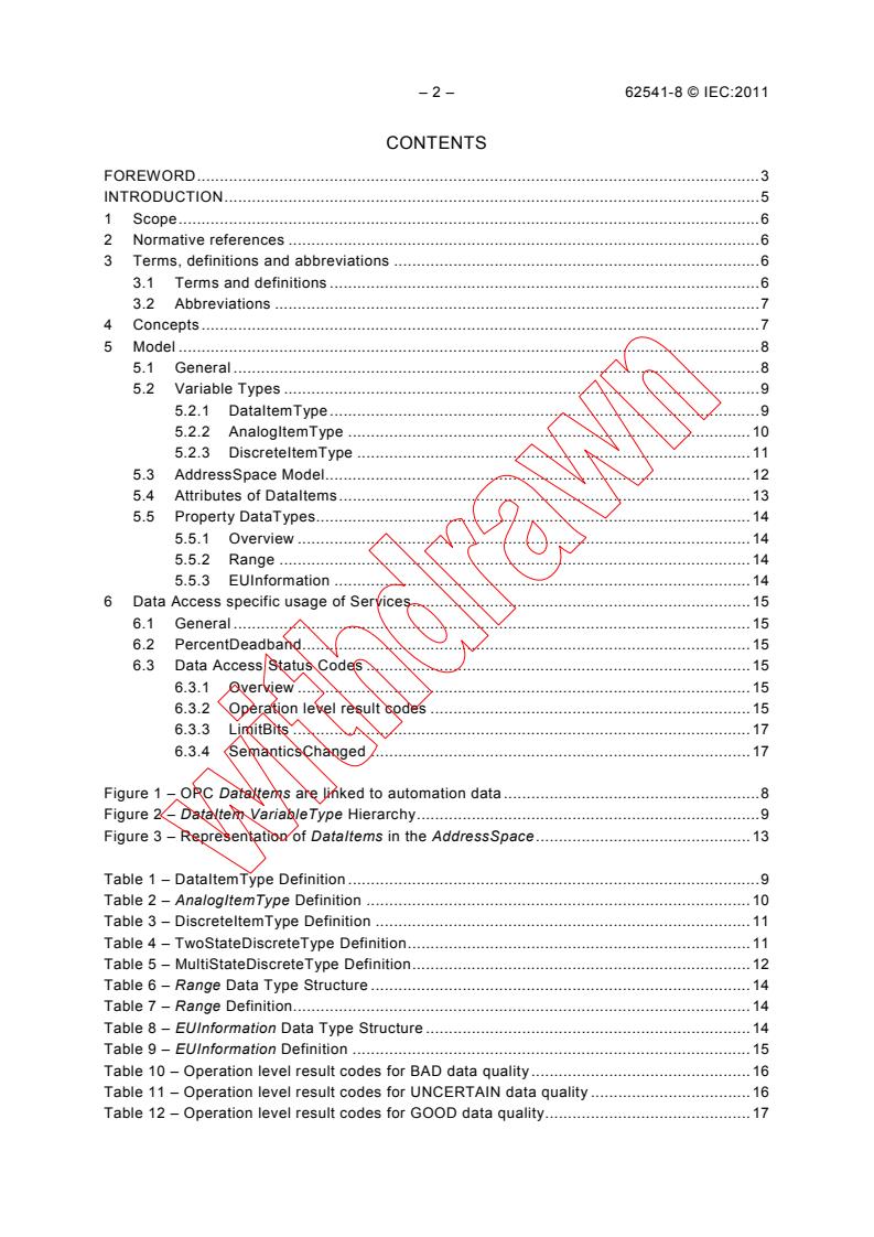 IEC 62541-8:2011 is part of the overall OPC Unified Architecture (OPC UA) standard series and defines the information model associated with Data Access (DA). It particularly includes additional VariableTypes and complemental descriptions of the NodeClasses and Attributes needed for Data Access, additional Properties and other information and behaviour.