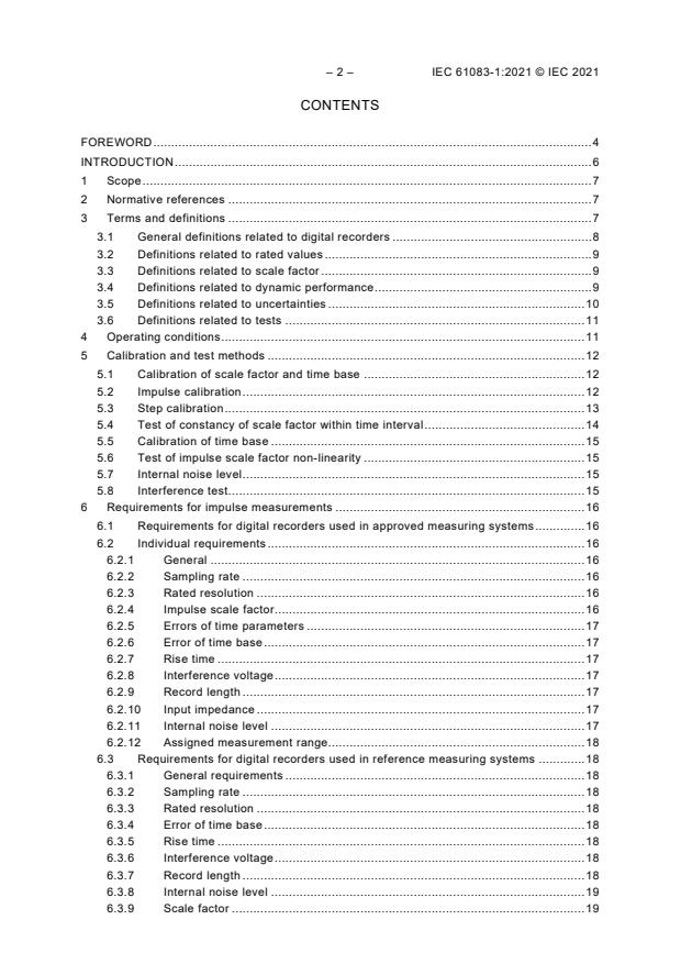 IEC 61083-1:2021 is applicable to digital recorders, including digital oscilloscopes, used for measurements during tests with high impulse voltages and high impulse currents. It specifies the measuring characteristics and calibrations required to meet the measuring uncertainties and procedures specified in IEC 60060-2 and IEC 62475. This document • defines the terms specifically related to digital recorders; • specifies the necessary requirements for such instruments to ensure their compliance with the requirements for high-voltage and high-current impulse tests; • establishes the tests and procedures necessary to demonstrate their compliance; • covers digital recorders that permit access to raw data from permanent or temporary storage; • covers peak meters used for measuring the extreme value of lightning impulses, the peak value of switching or current impulses. It has the status of a horizontal standard in accordance with IEC Guide 108. This horizontal standard is primarily intended for use by technical committees in the preparation of standards in accordance with the principles laid down in IEC Guide 108. One of the responsibilities of a technical committee is, wherever applicable, to make use of horizontal standards in the preparation of its publications. The contents of this horizontal standard will not apply unless specifically referred to or included in the relevant publications. This third edition cancels and replaces the second edition published in 2001. This edition constitutes a technical revision. This edition includes the following significant technical changes with respect to the previous edition: a) Requirements for static integral non-linearity and static differential non-linearity have been removed. b) Requirement for impulse scale factor non-linearity has been added. c) Uncertainty requirements for impulse calibrators have been revised. d) Requirements for peak voltmeter have been revised.