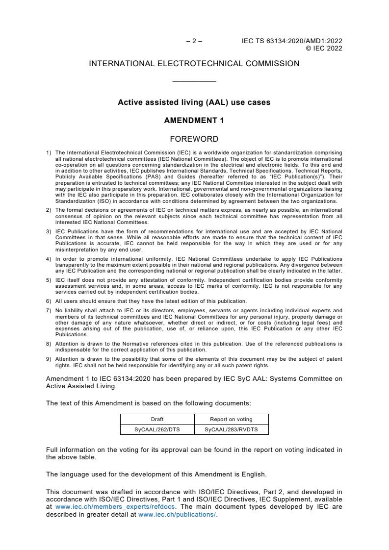 IEC TS 63134:2020/AMD1:2022 is a technical specification published by the International Electrotechnical Commission (IEC). Its full title is "Amendment 1 - Active Assisted Living (AAL) use cases". This standard covers: Amendment 1 - Active Assisted Living (AAL) use cases