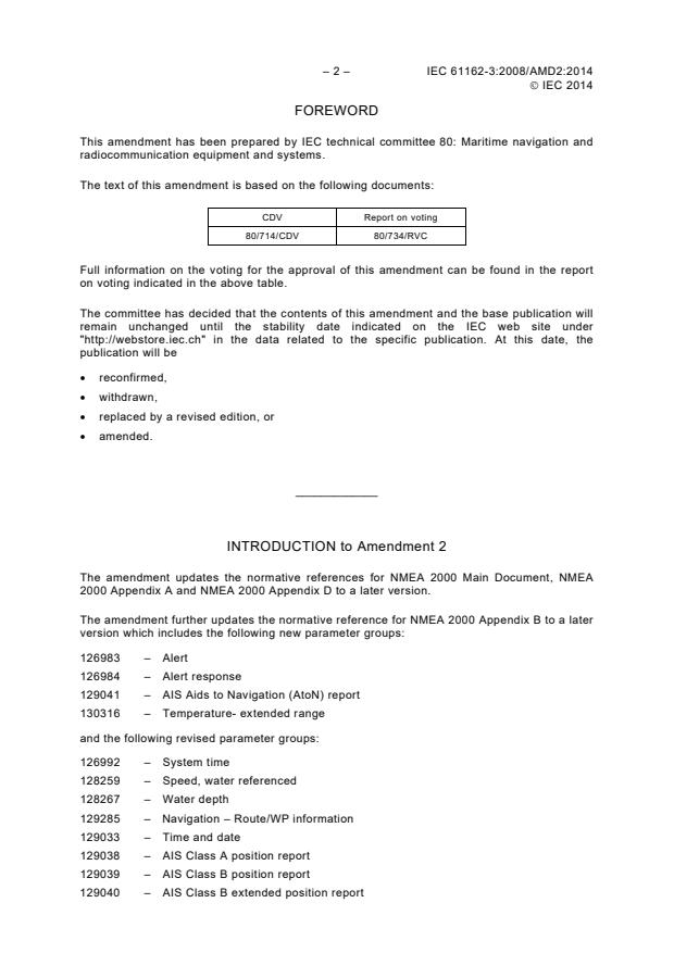 IEC 61162-3:2008/AMD2:2014 has the following relationships with other standards: It is inter standard links to IEC 61162-3:2008. Understanding these relationships helps ensure you are using the most current and applicable version of the standard.