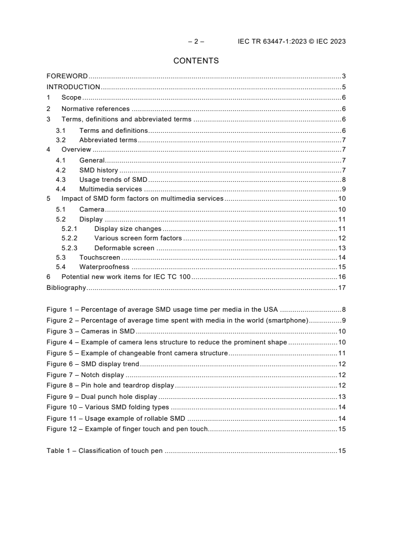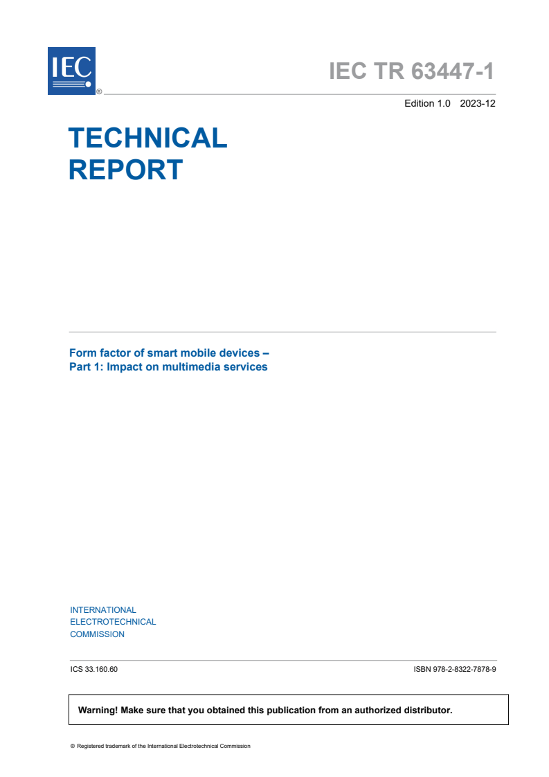 Keywords: IEC TR 63447-1:2023, form factor, smart mobile devices, SMD, multimedia services, display, camera, touchscreen, foldable, rollable, IEC, TC 100.