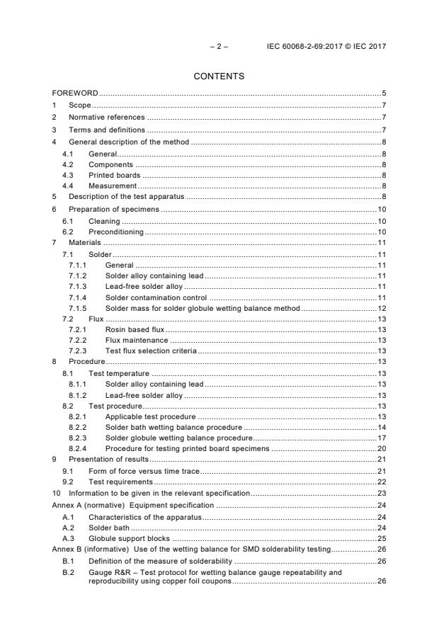 This 2017 edition consolidates and updates prior standards, including integrating IEC 60068-2-54. It introduces new component types, includes printed board testing, and updates test parameters and calibration protocols. The measurement techniques outlined include the solder bath wetting balance method and the solder globule wetting balance method, applicable to both lead-based and lead-free solder alloys.