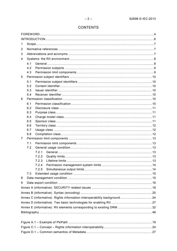 La CEI 62698:2013 définit la sémantique et les éléments fondamentaux communs d'interopérabilité d'information des droits pour les systèmes/matériels de TVIP permettant d'utiliser légalement un contenu multimédia sur différentes plates-formes. L'information des droits comporte des métadonnées associées aux droits et à la sécurité, qui sont décrites dans l'UIT-T H.750.