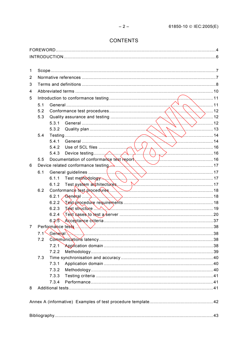 Specifies standard techniques for testing of conformance of implementations, as well as specific measurement techniques to be applied when declaring performance parameters. The use of these techniques will enhance the ability of the system integrator to integrate IEDs easily, operate IEDs correctly, and support the applications as intended.