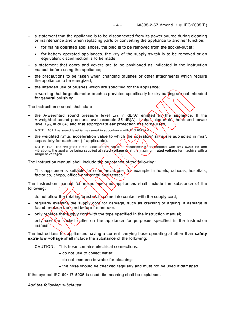 IEC 60335-2-67:2002/AMD1:2005 - Amendment 1 - Household and similar electrical appliances - Safety - Part 2-67: Particular requirements for floor treatment and floor cleaning machines, for industrial and commercial use Released:9/29/2005 Isbn:2831882591