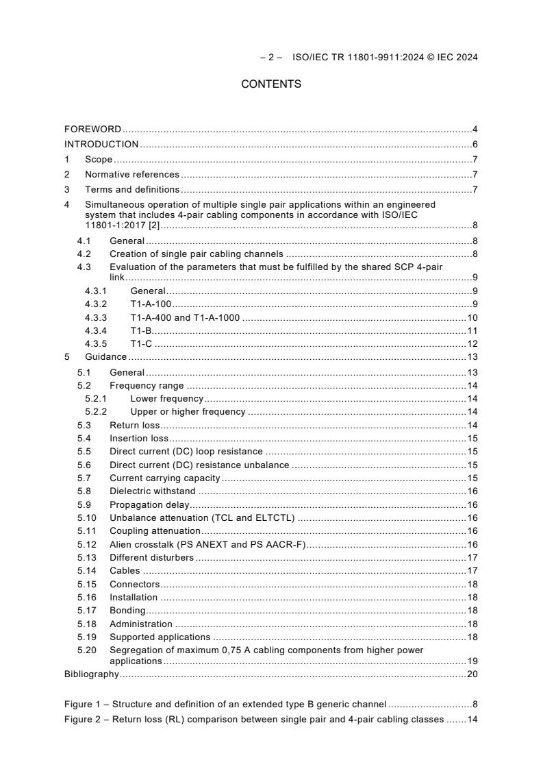 Keywords: ISO/IEC TR 11801-9911:2024, balanced single pair, 4‑pair cabling system, single pair remote powering, insertion loss, return loss, alien crosstalk, SCP link.