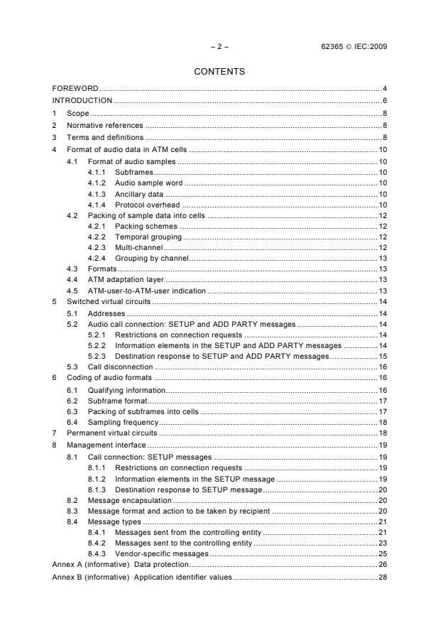 IEC 62365:2009 specifies a means to carry multiple channels of audio in linear PCM or IEC 60958-4 format over an ATM layer service conforming to ITU-T Recommendation I.150. It includes a means to convey, between parties, information concerning the digital audio signal when setting up audio calls across the ATM network. This bilingual version (2012-08) corresponds to the monolingual English version, published in 2009. This second edition of IEC 62365 cancels and replaces the first edition published in 2004.The main changes with respect to the previous edition (2004) are: second, third, and fourth required formats in 4.3 removed. 4.3 reformatted, eliminating Table 2, and subsequent Tables renumbered.