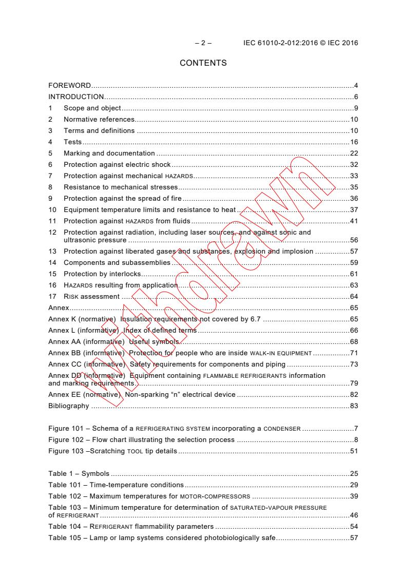 IEC 61010-2-012:2016 is a standard published by the International Electrotechnical Commission (IEC). Its full title is "Safety requirements for electrical equipment for measurement, control, and laboratory use - Part 2-012: Particular requirements for climatic and environmental testing and other temperature conditioning equipment". This standard covers: IEC 61010-2-012:2016 specifies safety requirements for electrical equipment and their accessories within the categories a) through c), wherever they are intended to be used, whenever that equipment incorporates one or more of the following characteristics: - A REFRIGERATING SYSTEM that is acted on or impacted by an integral heating function such that the combined heating and cooling system generates additional and/or more severe HAZARDS than those for the two systems if treated separately. - The materials being treated in the intended application introduce significant heat into the REFRIGERATING SYSTEM that the cooling system in the application yield additional and/or more severe HAZARDS than those for the cooling system if operated at the maximum RATED ambient alone. - An irradiation function for the materials being treated presenting additional HAZARDS. - A function to expose the materials being treated to excessive humidity, carbon dioxide, salt mist, or other substances which may result in additional HAZARDS. - A function of MECHANICAL MOVEMENT presenting additional HAZARDS. - Provision for an OPERATOR to walk-in to the operating area to load or unload the materials being treated. It has the status of a group safety publication in accordance with IEC Guide 104. This publication is to be read in conjunction with IEC 61010-1:2010.