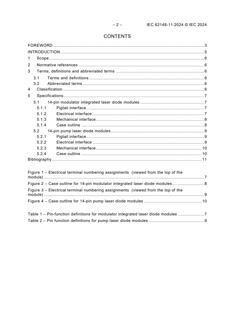 Keywords: IEC 62148-11:2024, 14-pin modulator integrated laser diode modules, pump laser diode modules, fibre optic active components, package standard, interface standard, thermo-electric cooler, optical fibre connectors, laser diode transmitter modules, fibre amplifiers, mechanical interchangeability.