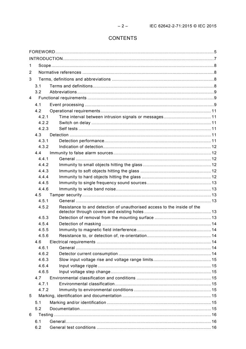 IEC 62642-2-71:2015 is a standard published by the International Electrotechnical Commission (IEC). Its full title is "Alarm systems - Intrusion and hold-up systems - Part 2-71: Intrusion detectors - Glass break detectors (acoustic)". This standard covers: IEC 62642-2-71:2015 defines passive acoustic glass break detectors installed in buildings and provides for security grades 1 to 4 (see IEC 62642-1), specific or non-specific wired or wire-free detectors, and uses environmental classes I to IV (see IEC 62599-1).