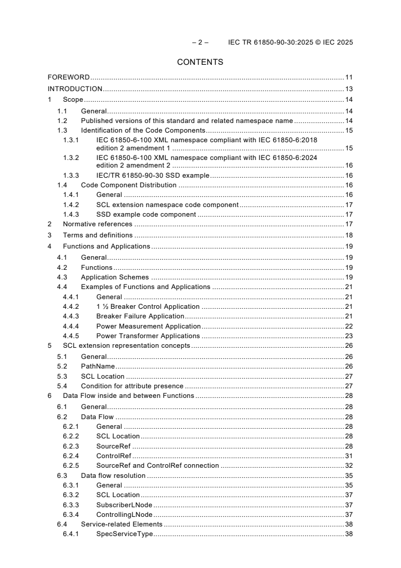 IEC TR 61850-90-30:2025, which is a Technical Report, describes extensions of the SCL Substation/Process Section allowing the creation of a comprehensive, IED and hardware independent specification of an IEC 61850 based power system. It addresses how to: • decompose functions in SCL • show function classifications in SCL • relate functions with the SCL Substation and Process Section • relate functions to Logical Nodes and IEDs/Specification IEDs • present information flow between functions in a hardware/implementation independent way • position Functions in relation to "Application Schemes", "Distributed Functions", "Protection Schemes" • consider the relationship to Basic Application Profiles (BAP) defined in IEC TR 61850-7-6 The document addresses the engineering process as far as it is related to the specification of Functions and their instantiation in IEC 61850 based power system. This includes the impact on the SCL Process Section during system configuration. The engineering process related to the definition of Applications and their instantiation is addressed in the Basic Application Profile Document (BAP) in IEC TR 61850-7-6. The System Configuration process is described in IEC 61850-6. Modifications and extensions of SCL are done in a way to guarantee backwards compatibility. In addition, this document introduces: • Some further elements to SCL that improve the content and usefulness of SSD files and facilitate the handling of SCL files for engineering purposes, • New variants of IED specific files: ISD file and FSD files, • Evolution of the engineering rights management, to first improve the usage of SED and add a new concept of System Configuration Collaboration (SCC file) which allows collaboration on the same project with different engineers.
