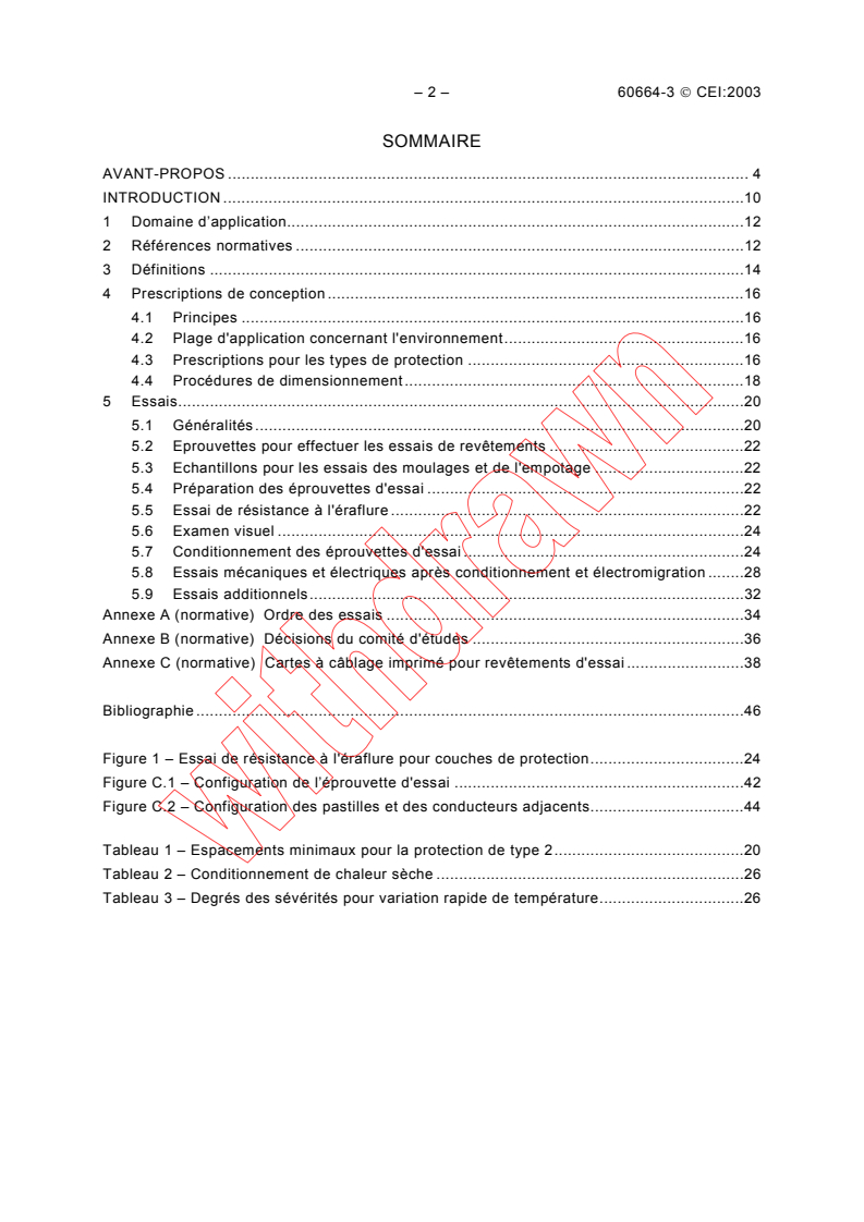 Applicable aux ensembles protégés contre la pollution au moyen de revêtement, d'empotage ou de moulage, permettant ainsi une réduction des distances d'isolement et des lignes de fuite décrites dans la Partie 1 ou la Partie 5. Cette norme décrit les prescriptions et procédures d'essai pour deux méthodes de protection: - la protection de type 1 améliore le micro-environnement des parties sous protection; - la protection de type 2 est considérée comme similaire à l'isolation solide. La présente norme s'applique également à toutes sortes de cartes imprimées protégées, y compris la surface de couches internes de cartes multicouches, de substrats et d'ensembles protégés de manière similaire. Dans le cas de cartes imprimées multicouches, les distances à travers une couche interne sont couvertes par les prescriptions pour l'isolation solide dans la Partie 1. La présente norme fait uniquement référence à une protection permanente. Elle n'englobe pas les ensembles soumis à une mise au point mécanique ou à des réparations. Les principes de cette norme sont applicables à l'isolation fonctionnelle, principale, supplé-mentaire et renforcée. A le statut d'une publication fondamentale de sécurité conformément au Guide 104 de la CEI. Les modifications majeures effectuées au cours de la révision de la CEI 60664-3 ont été les suivantes: - La Partie 3 a été alignée exactement à la Partie 1 (y compris les amendements 1 et 2). Il a été précisé que la Partie 3 ne peut être utilisée que comme un document entier ainsi que la Partie 1 de la CEI 60664. - Le domaine d'application de la Partie 3 a été considérablement élargi, en incluant à présent le moulage et l'empotage et les procédures similaires fournissant une protection contre la pollution. La norme s'applique également à toutes sortes de cartes imprimées enduites, y compris la surface de couches internes de cartes multicouches, de substrats et d'ensembles protégés similaires. Les distances à travers une couche interne de cartes multicouches sont cependant couvertes par les prescriptions pour l'isolation solide de la Partie 1. - La différence entre les deux types de protection a été clarifiée. La protection de type 1 (précédemment type A) aboutit à une réduction du degré de pollution présente au-delà de la protection pour le degré 1 de pollution. La protection de type 2 (précédemment type B) introduit des systèmes de protection qui peuvent être considérés comme similaires à l'isolation solide. Par conséquent, les prescriptions de dimensionnement et d'essais ont été alignées d'une meilleure façon. - Le domaine d'application a été élargi, en incluant à présent l'isolation fonctionnelle, principale, supplémentaire et renforcée. - Les protections de type 1 et type 2 peuvent maintenant être utilisées dans des conditions de degré 3 de pollution (précédemment type B). - Non seulement la protection de type 2 mais également la protection de type 1 nécessitent que, entre les deux parties conductrices, 100 % de la distance à travers l'espacement soient couverts par la protection. - Pour la protection de type 2, des distances minimales ont été introduites. Dans tous les cas, les espacements ne doivent pas être inférieurs à la valeur minimale de 10 µm. - Il est également fait référence à la nouvelle Partie 5 de la CEI 60664. - Les essais suivent de beaucoup plus près les différentes prescriptions pour les protections de type 1 et type 2. L'ensemble protégé doit résister aux essais électriques concernant l'isolation solide de 4.1.2 de la CEI 60664-1. Pour la protection de type 1, l'essai de décharge partielle n'est pas applicable. Pour la protection de type 2, l'essai de décharge partielle est exigé. La tension d'extinction de décharge partielle prescrite et la méthode d'essai sont spécifiées en 4.1.2.4 de la CEI 60664-1. - Les prescriptions pour l'éprouvette d'essai ont été alignées en élargissant le domaine d'application. - Les essais concernant «l'adhérence du revêtement» et «l'essai de résistance aux éraflur