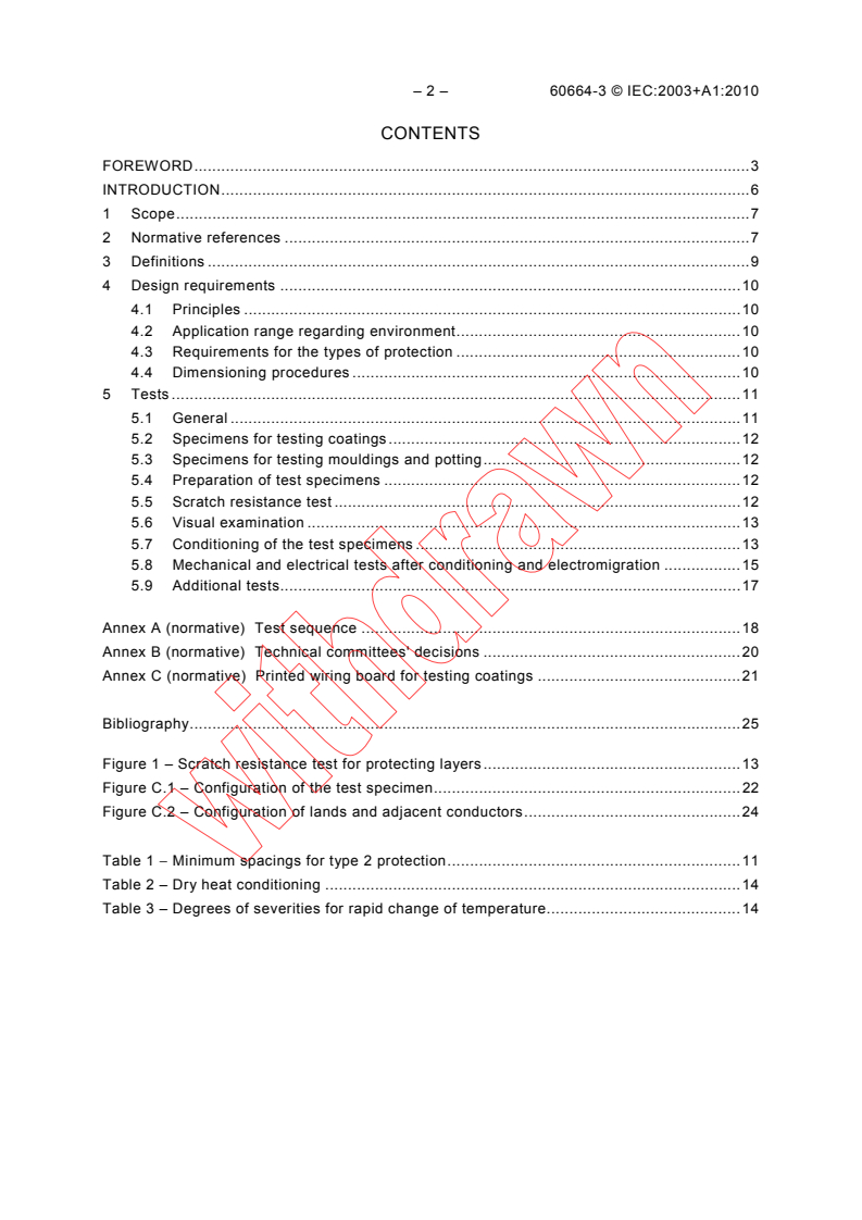 Applies to assemblies protected against pollution by the use of coating, potting or moulding, thus allowing a reduction of clearance and creepage distances as described in Part 1 or Part 5. This standard describes the requirements and test procedures for two methods of protection: - type 1 protection improves the microenvironment of the parts under the protection; - type 2 protection is considered to be similar to solid insulation. This standard also applies to all kinds of protected printed boards, including the surface of inner layers of multi-layer boards, substrates and similarly protected assemblies. In the case of multi-layer printed boards, the distances through an inner layer are covered by the requirements for solid insulation in Part 1. This standard refers only to permanent protection. It does not cover assemblies that are subjected to mechanical adjustment or repair. The principles of this standard are applicable to functional, basic, supplementary and reinforced insulation. Has the status of a basic safety publication in accirdance with IEC Guide 104. The major changes made during the revision of IEC 60664-3 were the following: - Part 3 has been exactly aligned with Part 1 (including amendments 1 and 2). It has been made clear that Part 3 can only be used as a whole document together with Part 1 of IEC 60664. - The scope of Part 3 has been greatly extended including now also potting and moulding and similar procedures providing protection against pollution. The standard also applies to all kinds of coated printed boards including the surface of inner-layers of multi-layer boards, substrates and similar protected assemblies. The distances through an inner layer of multi-layer boards however are covered by the requirements for solid insulation in Part 1. - The difference between the two types of protection has been clarified. Type 1 (formerly type A) protection leads to a reduction of the pollution degree present beyond the protection to pollution degree 1. Type 2 (formerly type B) protection introduces protection systems which can be considered similar to solid insulation. Consequently the dimensioning and test requirements have been aligned more correctly. - The area of application has been extended including now functional, basic, supplementary and reinforced insulation. - Type 1 and type 2 protection now can both be used under the conditions of pollution degree 3 (formerly only type B). - Not only type 2 protection but also type 1 protection requires that between two conductive parts 100 % of the distance across the spacing shall be covered by the protection. - For type 2 protection minimum distances have been introduced. In any case the spacings shall not be lower than the minimum value of 10 µm. - Also the new Part 5 of IEC 60664 is referred to. - The tests follow much more closely the different requirements for type 1 and type 2 protection. The protected assembly shall withstand the electrical tests for solid insulation in 4.1.2 of IEC 60664-1. For type 1 protection, the partial discharge test is not applicable. For type 2 protection, the partial discharge test is required. The required partial discharge extinction voltage and the test method are specified in 4.1.2.4 of IEC 60664-1. - The requirements for the test specimen have been aligned with the extended scope. - The tests for the "adhesion of coating" and the "scratch resistance test" have been updated.