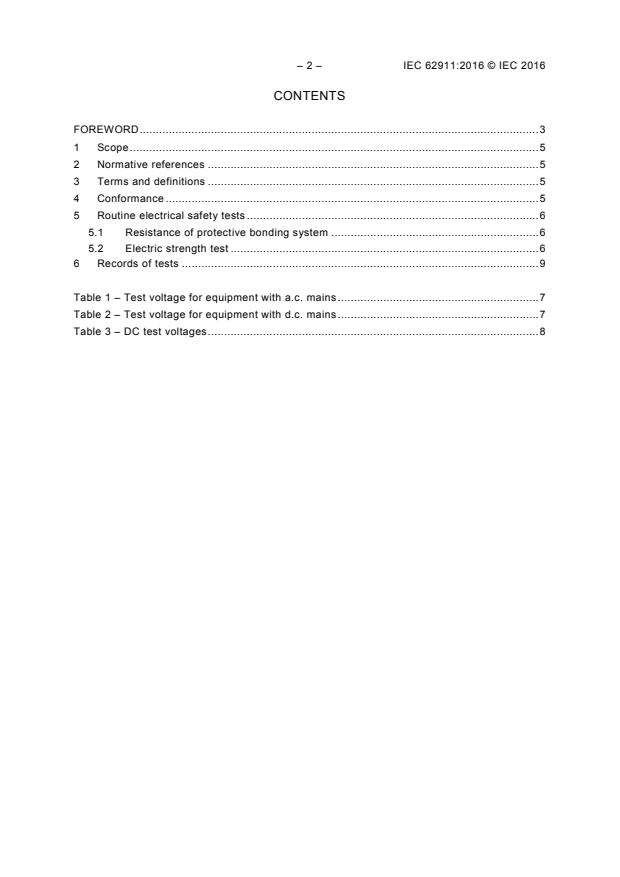 IEC 62911:2016 is a standard published by the International Electrotechnical Commission (IEC). Its full title is "Audio, video and information technology equipment - Routine electrical safety testing in production". This standard covers: IEC 62911:2016 defines routine electrical safety test procedures for use during or after manufacturing of complete equipment, sub-assemblies or components, complying with IEC 60065, IEC 60950-1 or IEC 62368-1 and powered by an a.c. mains supply or d.c. mains supply, to detect manufacturing failures and unacceptable tolerances in manufacturing and materials. All the tests defined in this standard do not necessarily have to be performed at the end product manufacturing location. The optimal location for the routine electrical safety tests can be defined by the equipment manufacturer and reviewed under the conformity assessment scheme. Key words: Audio, Video Electrical Safety Test