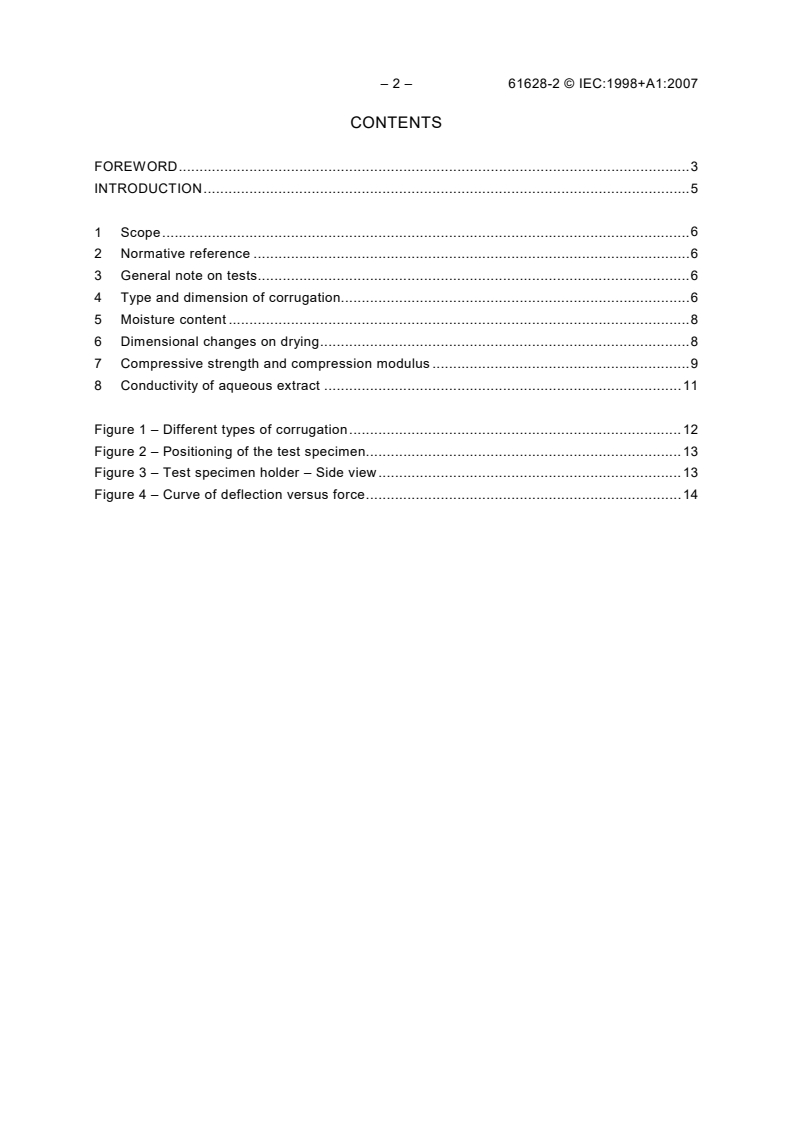 Keywords: IEC 61628-2, corrugated pressboard, presspaper, electrical insulation, methods of test, corrugation dimensions, moisture content, compressive strength, dimensional stability, electrical insulating materials, IEC standards.