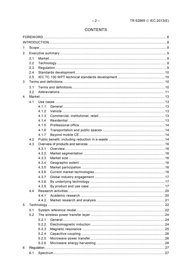 IEC TR 62869:2013 is a technical report published by the International Electrotechnical Commission (IEC). Its full title is "Activities and considerations related to wireless power transfer (WPT) for audio, video and multimedia systems and equipment". This standard covers: IEC/TR 62869:2013(E) addresses activities and considerations related to wireless power transfer for audio, video and multimedia systems and equipment. It combines public information, contributions by experts and completed IEC TC 100 WPT survey responses and reviews global market conditions. The TR describes a range of WPT technical approaches with the aid of a system reference model, outlines the impacts on WPT of applicable regulation and surveys standards development organization (SDO) and private industry consortium-led activities in support of WPT technical standards development. The TR concludes with observations and recommendations for potential future technical standards development activities that lie within scope of IEC TC 100.