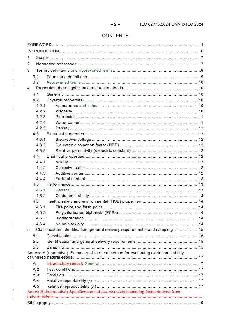 IEC 62770:2024 is a standard published by the International Electrotechnical Commission (IEC). Its full title is "Fluids for electrotechnical applications - Unused natural esters for transformers and similar electrical equipment". This standard covers: IEC 62770:2024 describes specifications and test methods for unused natural esters in transformers and similar liquid-immersed electrical equipment in which a liquid is required as an insulating and heat transfer medium. The exposure of natural ester to air leads to deterioration of the insulating liquid. Use of natural esters is therefore restricted to sealed units, or with the conservator tank protected from the contact with atmosphere by a membrane or other suitable system.