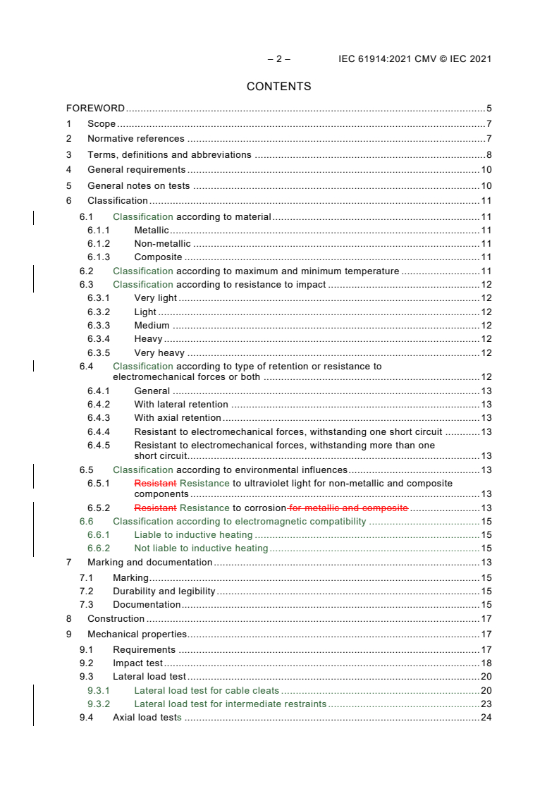 IEC 61914:2021 is a standard that specifies requirements and tests for cable cleats used in electrical installations. Cable cleats are used to secure cables and hold them together in formation. The document includes cable cleats that rely on a specified mounting surface for retaining cables in both axial and lateral directions. This version of the standard is the third edition and replaces the second edition from 2015. It is a technical revision and includes several important changes compared to the previous edition. These changes include rationalizing and detailing the requirements for mandrels used in testing, adding a definition for liners and specifying test requirements for when liners and other optional parts are used. Definitions for LV (low voltage), MV (medium voltage), and HV (high voltage) cables are also added, along with test requirements specifically for MV and HV cables. New corrosion resistance classes for plated products are added, as well as requirements and tests for the durability and legibility of markings on cable cleats. Additionally, new test requirements for axial load testing of cleats for multiple cables and lateral load testing for intermediate restraints are included in this edition.
