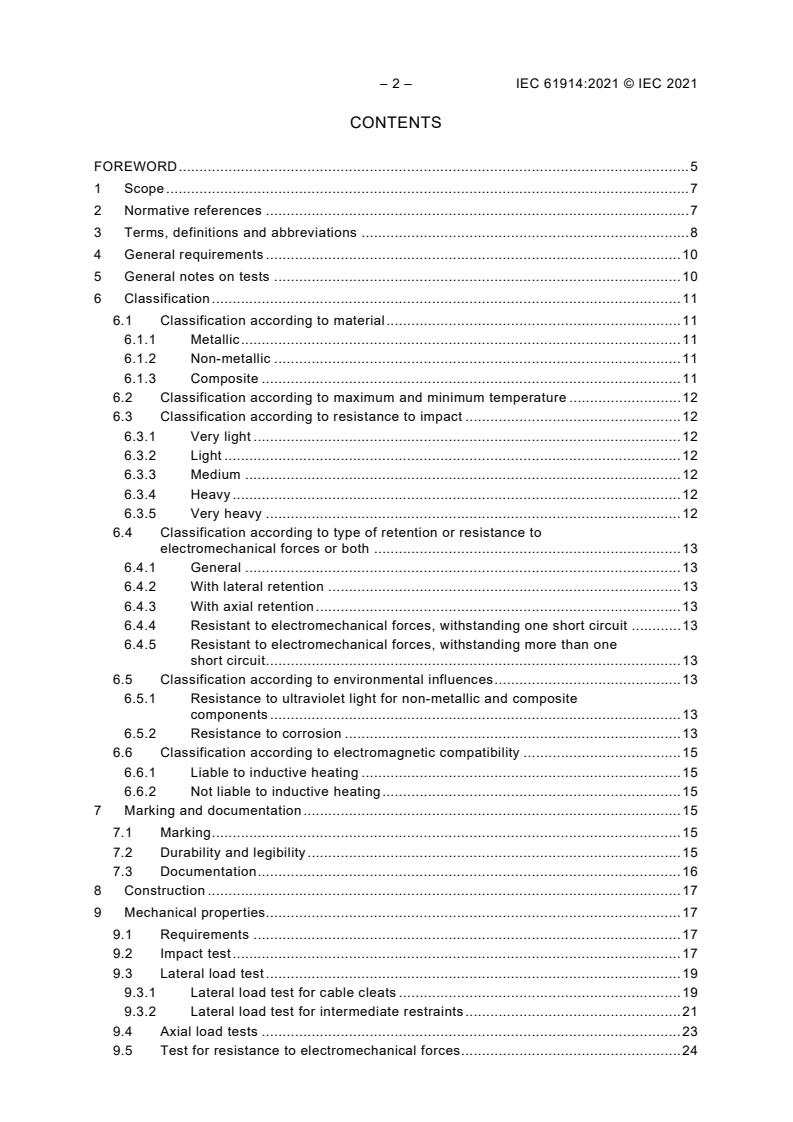 Keywords: IEC 61914:2021, cable cleats, cable restraint, electrical installations, electromechanical forces, axial load, lateral retention, corrosion resistance, short‑circuit testing.