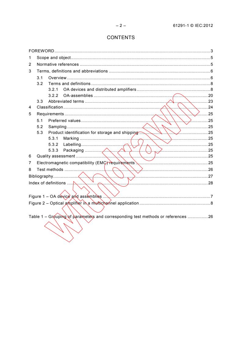 IEC 61291-1:2012 is an international standard developed by the International Electrotechnical Commission (IEC) that provides a generic specification for optical amplifiers (OAs). This third edition supersedes the 2006 version, addressing a broad spectrum of commercially available optical amplifiers and optically amplified assemblies. It covers amplifiers using various technologies such as optically pumped fibres (including rare-earth doped fibres and Raman effect-based amplifiers), semiconductor optical amplifiers (SOAs), and planar optical waveguide amplifiers (POWAs).