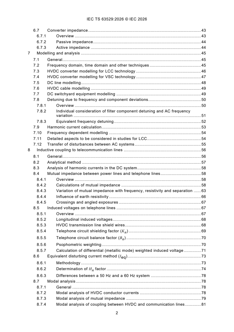 IEC TS 63529:2026, which is a Technical Specification, is intended to inform and guide the harmonic design of the DC side of HVDC projects. It considers all aspects of AC current and voltage occurring on the DC circuit and also the interaction with adjacent systems. The switching action in HVDC converters results in a wide spectrum of harmonics. These range from the fundamental frequency to the radio frequency range. Traditionally the specification of DC side harmonic performance has been limited to the frequency range of interest for induced audible noise on nearby telephone systems. Often a limit of 50th harmonic has been applied, corresponding to 2 500 Hz or 3 000 Hz on 50 Hz and 60 Hz systems respectively. Occasionally the range has been extended to 5 000 Hz. This frequency range has corresponded to the spectrum of characteristic harmonic generation from thyristor line commutated converters (LCC). The introduction of HVDC voltage sourced converters (VSC) has meant that although the magnitude of DC side harmonic generation from these converters is generally lower, the generated spectrum of interest extends to higher frequencies. The scope of this document therefore covers the frequency range up to approximately 5 000 Hz. Higher frequencies are mentioned only when relevant. The scope excludes the much higher frequency ranges appropriate to PLC communication and the radio interference spectra.