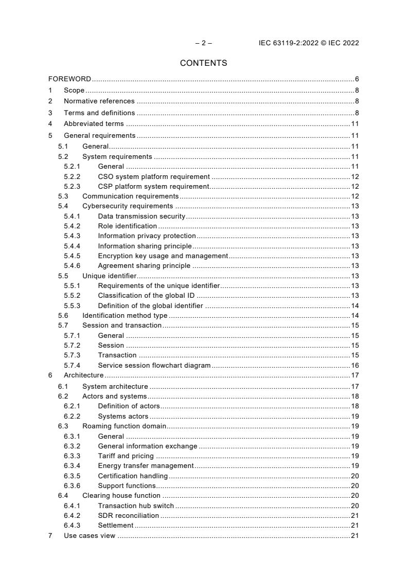 IEC 63119-2:2022 specifies roaming use cases of information exchange between EV charging service providers (CSP), charging station operators (CSOs) and clearing house platforms through roaming endpoints. The elementary use cases defined in this document are designed to support the user to have access to the EV supply equipment which does not belong to the home-CSP. IEC 63119 (all parts) is applicable to high-level communication involved in information exchange/interaction between different CSPs, as well as between a CSP and CSO with or without clearing house platform through the roaming endpoint. IEC 63119 (all parts) does not specify the communication either between charging station (CS) and charging station operator (CSO) or between EV and CS.