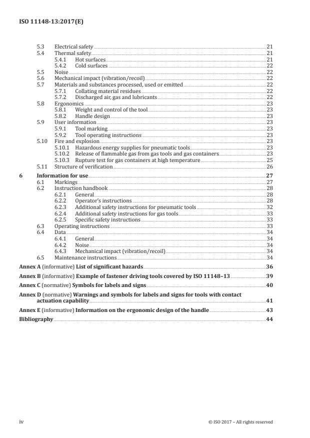 ISO 11148-13:2017 organizes safety requirements, verification and user information. Major technical topics include: