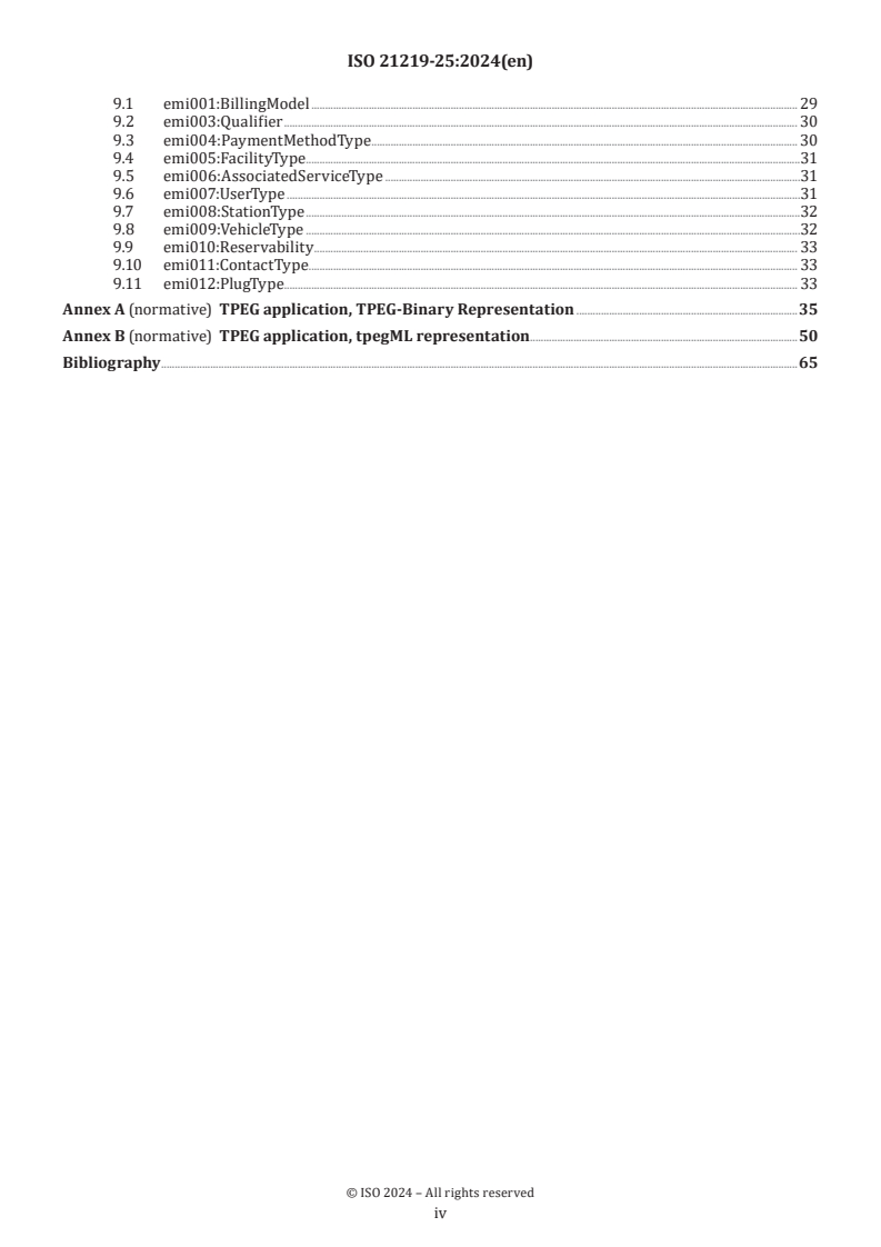 Keywords: ISO 21219-25:2024, TPEG2-EMI, electromobility charging infrastructure, EV charging availability, charging point reservation, connector type, TPEG, traffic and travel information.