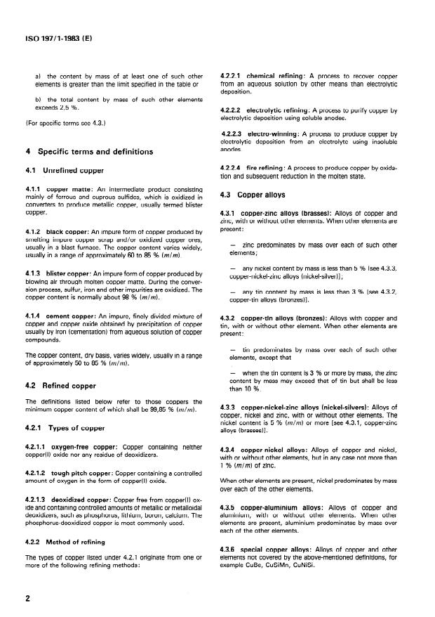 ISO 197-1:1983 is a standard published by the International Organization for Standardization (ISO). Its full title is "Copper and copper alloys - Terms and definitions - Part 1: Materials". This standard covers: Includes general terms and defitions (alloy, alloying element, impurity, master alloy, etc.), specific terms and definitions for unrefined copper (copper matte; black copper; etc.) and refined copper (oxygen-free copper, chemical refining, etc.) and copper alloys (brasses, bronzes, etc.). This part of ISO 197 gives a classification of copper and copper alloys including a dividing line between both for further details (annex).