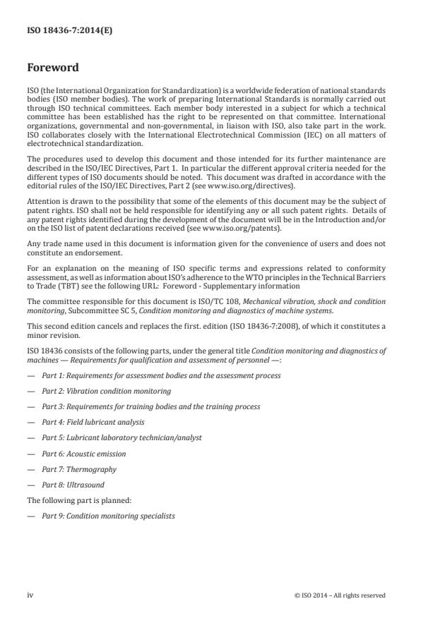 ISO 18436-7:2014 - "Condition monitoring and diagnostics of machines - Requirements for qualification and assessment of personnel - Part 7: Thermography" defines the requirements to qualify and assess personnel who use infrared thermography for machinery condition monitoring and diagnostics. The standard establishes a three-category classification (Category I, II and III) and specifies minimum training, eligibility, and assessment criteria to demonstrate competence in thermal measurement, analysis and reporting using portable thermal imaging equipment.