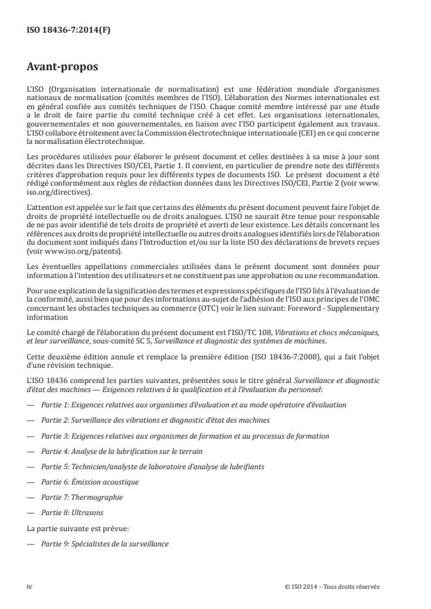 L'ISO 18436-7:2014 spécifie les exigences de qualification et d'évaluation du personnel chargé de la surveillance et du diagnostic d'état des machines utilisant la thermographie infrarouge. Un certificat ou une déclaration de conformité à l'ISO 18436-7:2014 est la preuve que les individus ont les qualifications et les compétences requises pour effectuer des mesures et des analyses thermiques pour la surveillance d'état des machines avec un appareil de thermographie infrarouge portable. Le présent mode opératoire peut ne pas s'appliquer à un équipement spécialisé ou à d'autres cas spécifiques. L'ISO 18436-7:2014 spécifie un programme de classification en trois catégories reposant sur les domaines techniques décrits dans le présent document.