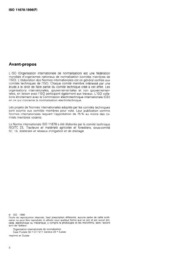 ISO 11678:1996 is a standard published by the International Organization for Standardization (ISO). Its full title is "Agricultural irrigation equipment - Aluminium irrigation tubes". This standard covers: Contains minimum requirements and test methods for aluminium tubes intended for use in agricultural irrigation systems at temperatures not exceeding 50 °C. Does not apply to tubes with integrated couplings.